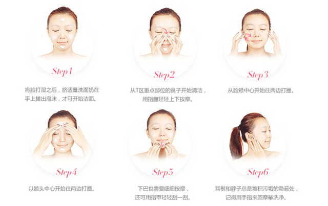 用温水使毛孔张开,用洁面乳或洁面奶适度按摩,让它们带走脏东西,然后,用清水冲洗,再用冷水收敛毛孔,最后一遍一定用冷水。